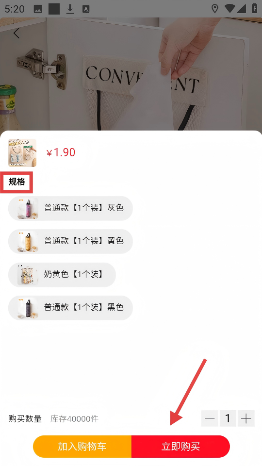 2、在商品详情页,点击右下角的【立即购买】按钮,进入规格选择界面。