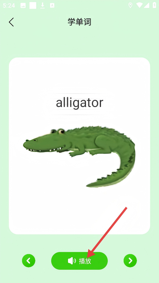 4、在学单词页面,点击绿色的【播放】按钮,可听取单词【alligator】的发音。