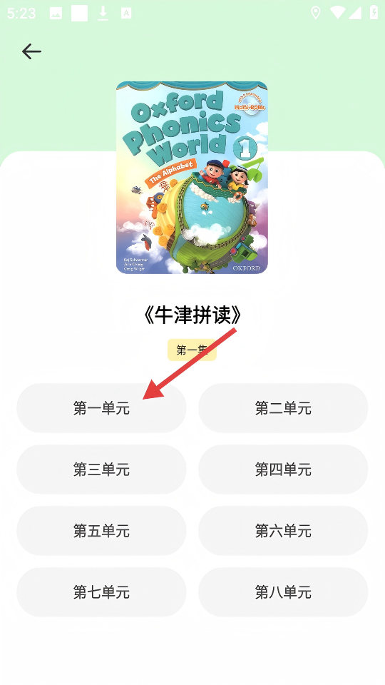 3、进入《牛津拼读》第一集的页面后,点击【第一单元】,即可开始该单元的学习。