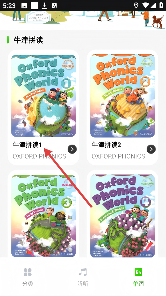 2、在【牛津拼读】栏目中,点击【牛津拼读1】,进入其对应的内容界面。