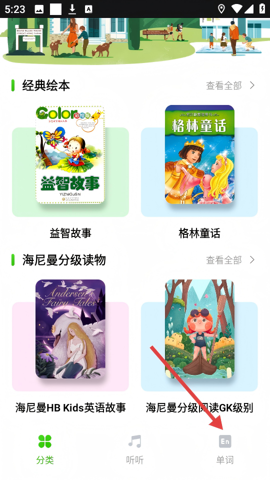1、点击页面底部的【单词】按钮,可进入单词相关的内容页面。