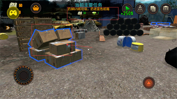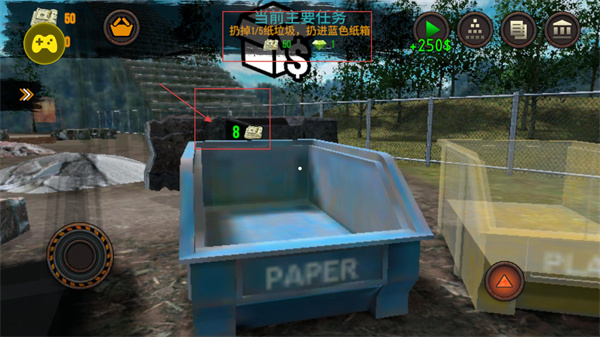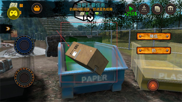 2、将拾取的纸箱移动至标注【PAPER】的蓝色容器处,点击【扔】按钮完成投放,单次投放可更新任务进度(如1/5),同时积累资源。