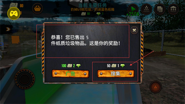 4、任务完成后,在奖励界面选择【搜集】按钮领取基础奖励(50资源+1钻石),或获取翻倍奖励,为后续任务积累资源。