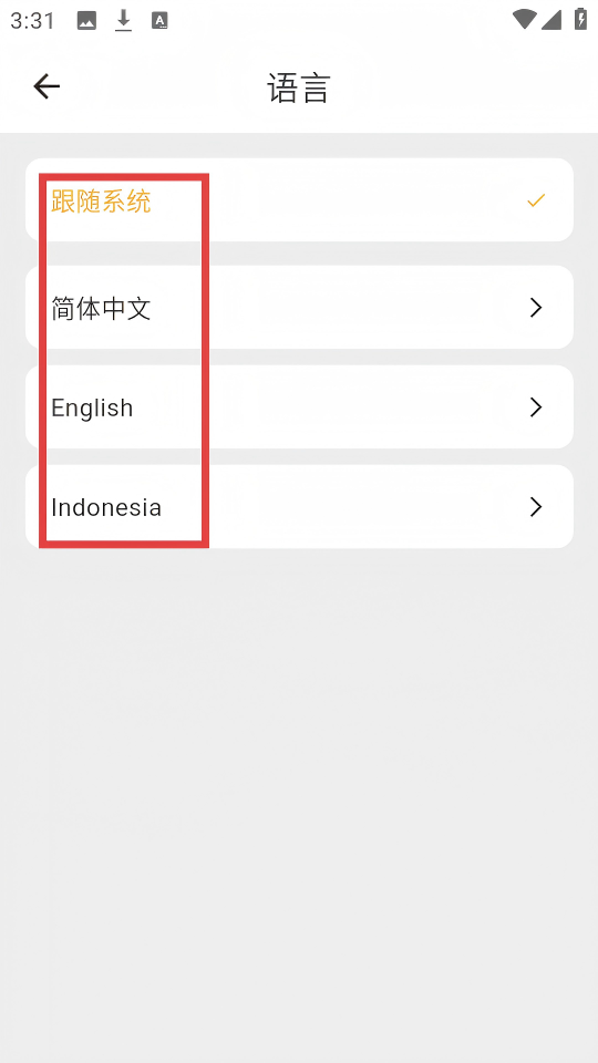 4、进入语言设置页面后,可选择【跟随系统】【简体中文】等中的任意一个语言选项来设置应用语言。