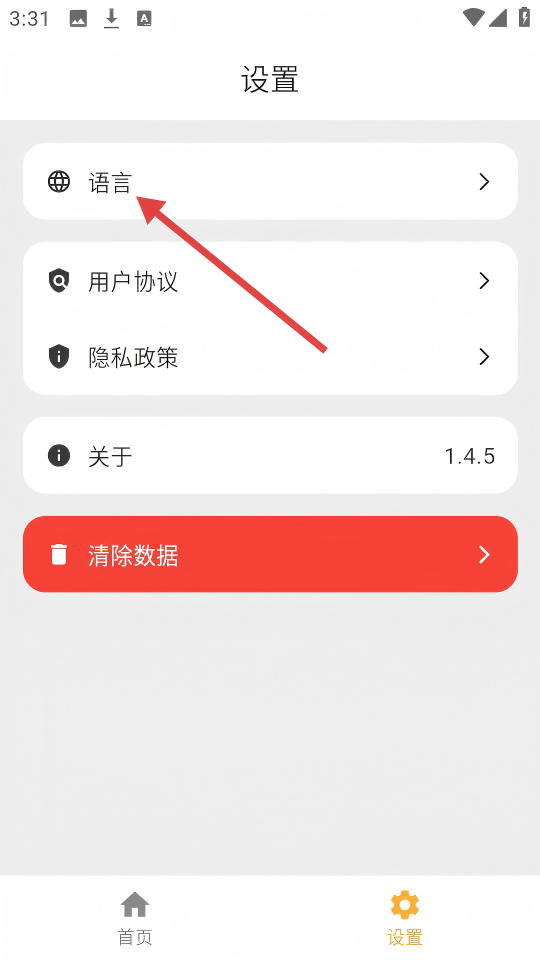 3、进入【设置】页面后,点击【语言】选项,可进入语言设置界面选择想要的语言。