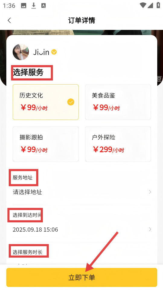 4、在订单详情页,完成【选择服务】【服务地址】【选择到达时间】等设置后,点击【立即下单】按钮即可下单。