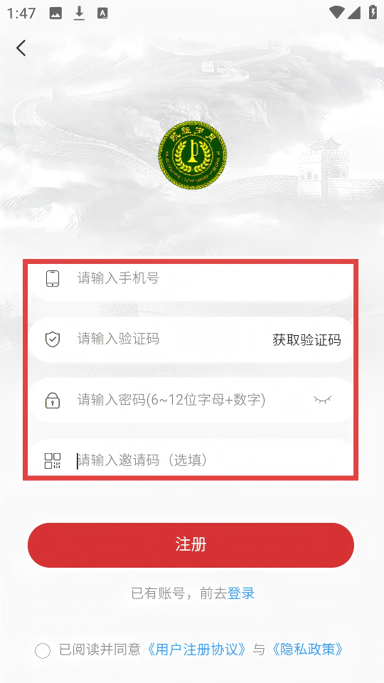 4、在注册页面,输入【手机号、验证码、密码】,选填邀请码后,点击注册按钮完成注册。