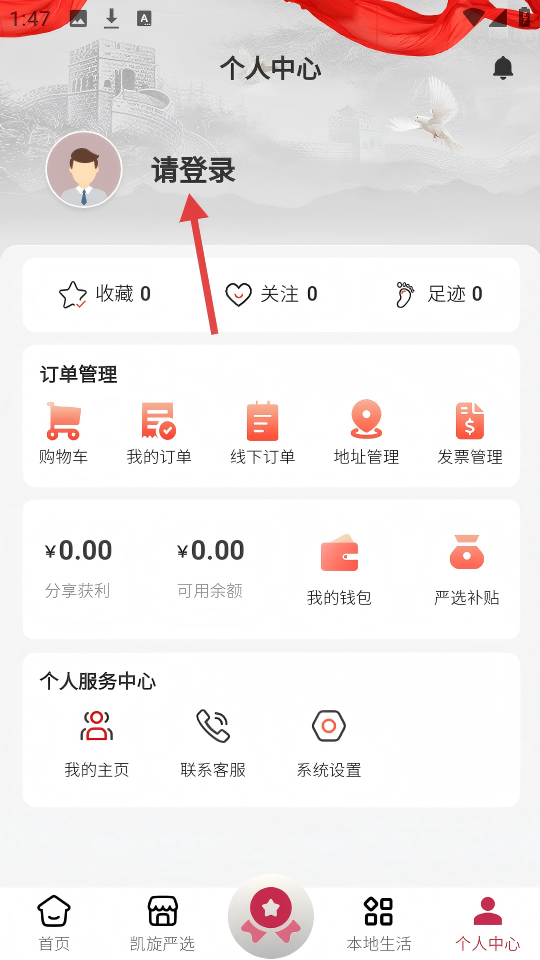 2、在【个人中心】页面,点击【请登录】可进入登录界面。
