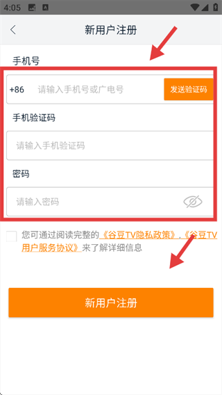 4、依次填写手机号、验证码和密码后,点击“新用户注册”按钮,完成账号注册操作。