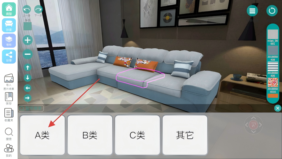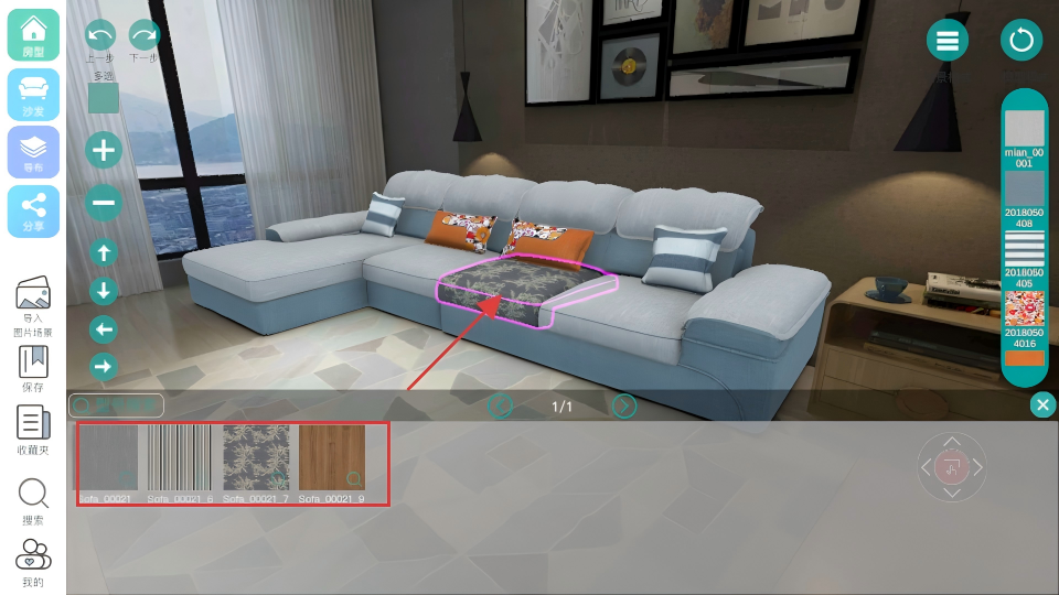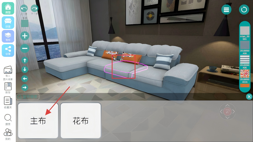 2、全维度配色操控系统:可自由搭配沙发颜色与布料材质,支持调整效果图大小、方向,实现全角度配色细节优化与调整。