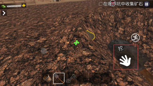 2、选择工具,点击【挖】,在爆炸坑内挖掘矿石,推进收集进程。