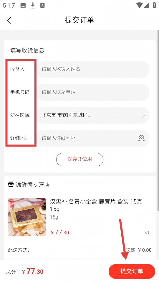 4、在提交订单页面,填写【收货人】【手机号码】【所在区域】【详细地址】后,点击【提交订单】。
