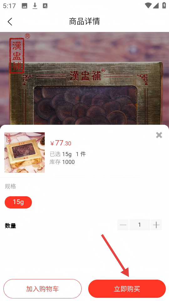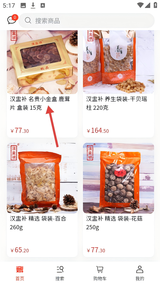 1、在首页选择【汉盅补名贵小金盒鹿茸片盒装15克】商品。
