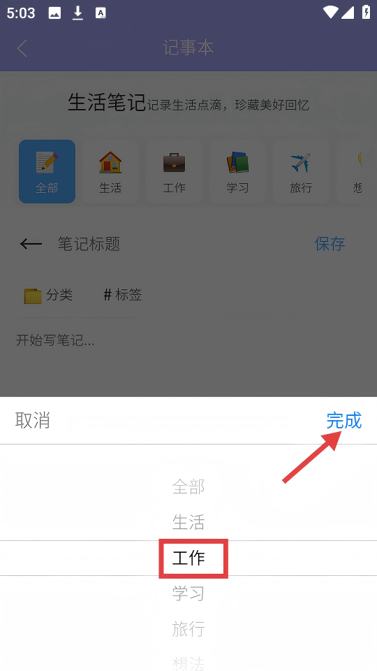 4、在分类选择列表中,选择【工作】分类,然后点击【完成】。
