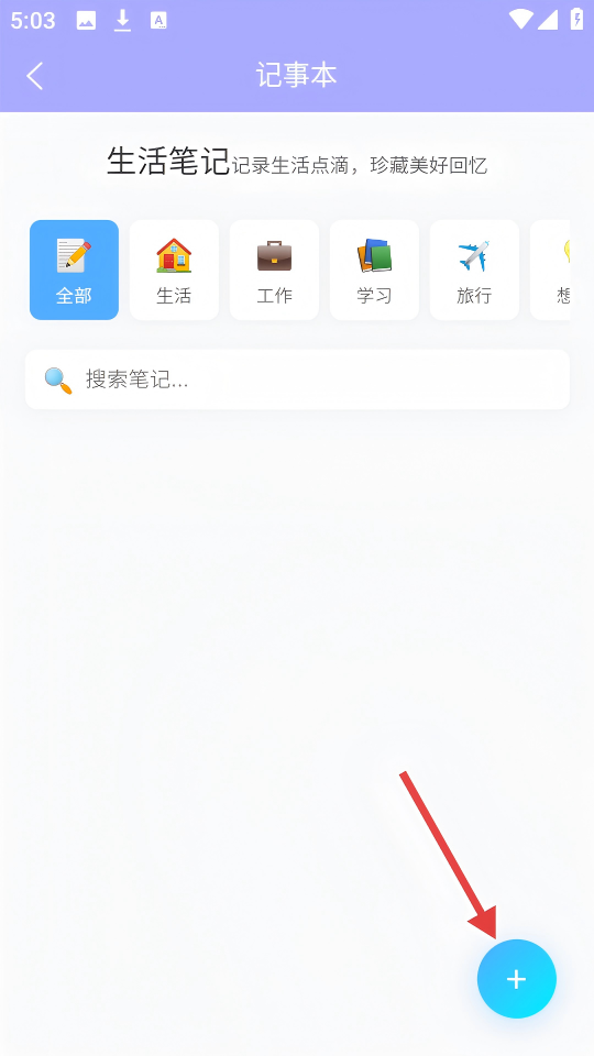 2、进入【记事本】界面后,点击右下角的蓝色【+】按钮。