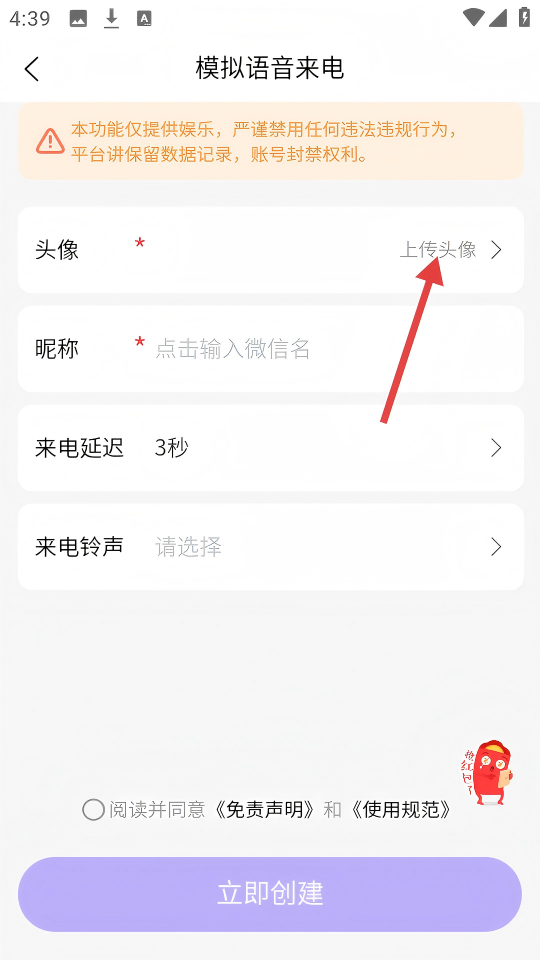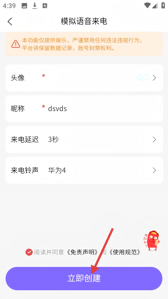 4、填写好昵称等信息,勾选【阅读并同意《免责声明》和《使用规范》】后,点击【立即创建】。