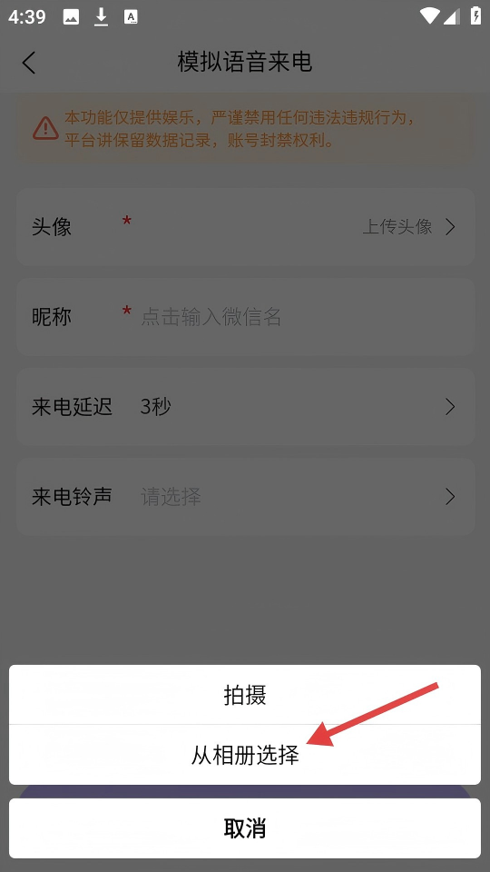 2、进入【模拟语音来电】界面,点击【上传头像】。