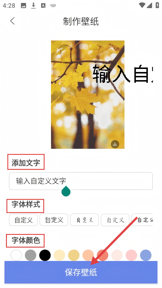4、在【制作壁纸】页面,可进行【添加文字】【字体样式】【字体颜色】等设置,完成后点击【保存壁纸】。