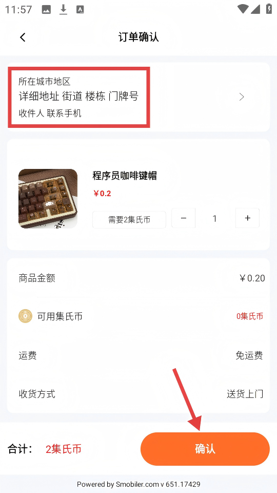 4、在订单确认页,填写【详细地址街道楼栋门牌号】等信息后,点击【确认】按钮。