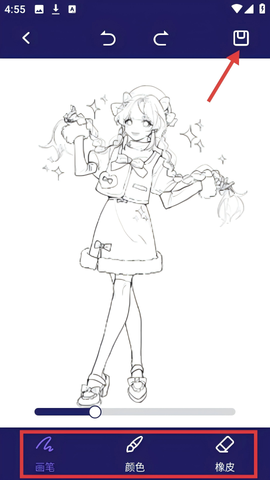 4、使用底部的【画笔】【颜色】【橡皮】等工具进行绘制,完成后点击右上角的保存图标。