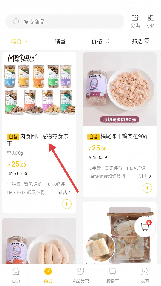2、在商品列表中点击【肉食回归宠物零食冻干】商品,进入其详情页。