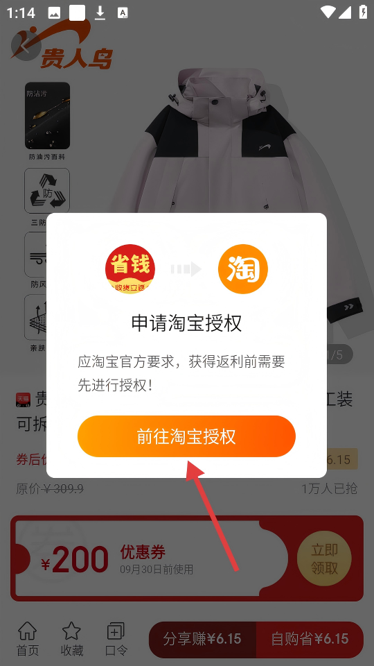 3、在商品详情页,点击【自购省¥6.15】,触发授权流程。