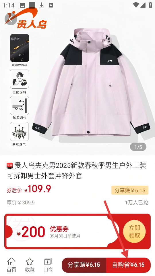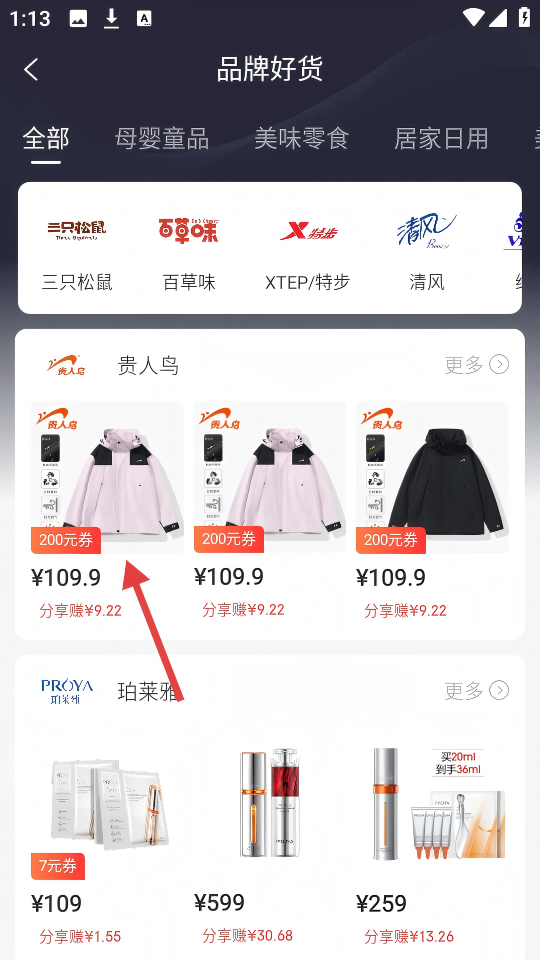 2、在品牌好货页面,点击想要的商品(如贵人鸟夹克),进入商品详情页。