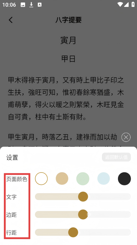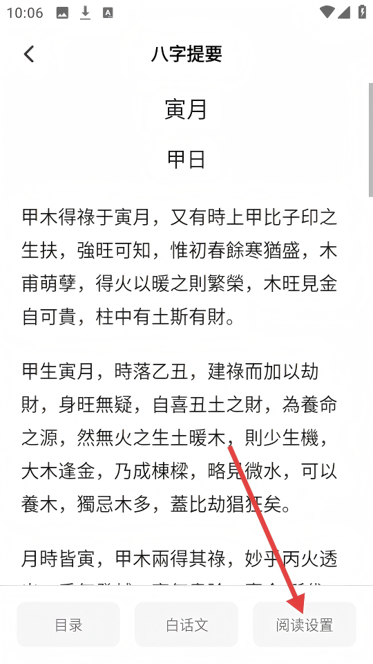 3、在【八字提要】阅读界面,点击页面下方的【阅读设置】按钮。
