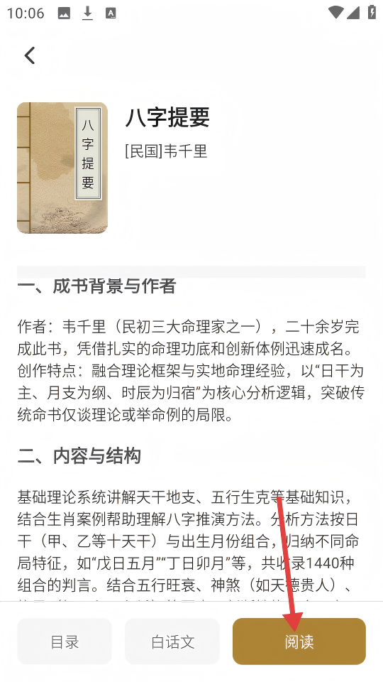 2、进入【八字提要】书籍详情页后,点击页面下方的【阅读】按钮。