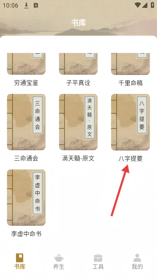 1、在书库界面中,找到并点击【八字提要】书籍图标。