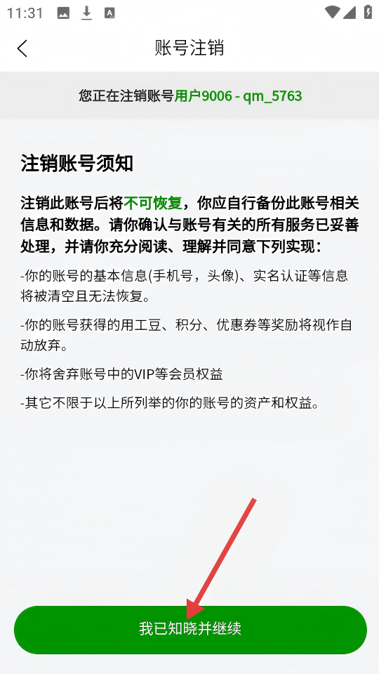 4、在【账号注销】页,阅读注销须知后,点击【我已知晓并继续】按钮。