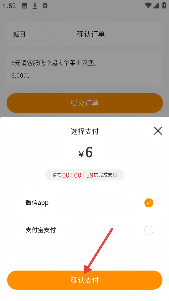 3、在确认订单页面,点击【提交订单】按钮,进入支付选择环节。