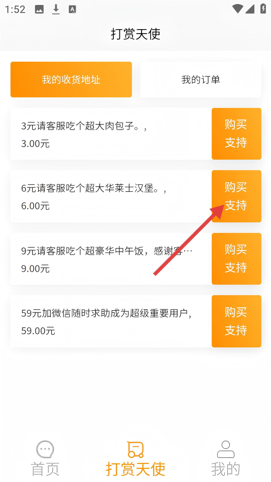 2、在打赏天使页面,点击对应项目右侧的【购买支持】按钮,可对该项目进行支持。
