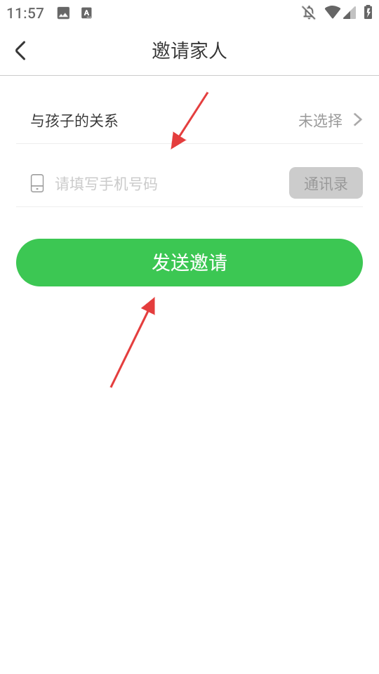 4、填写【与孩子的关系】和手机号后,点击【发送邀请】,即可完成家人邀请操作。
