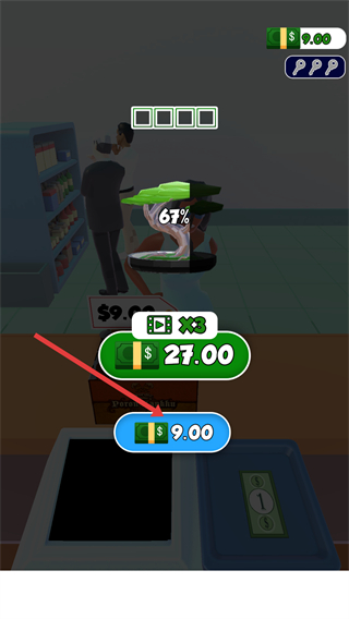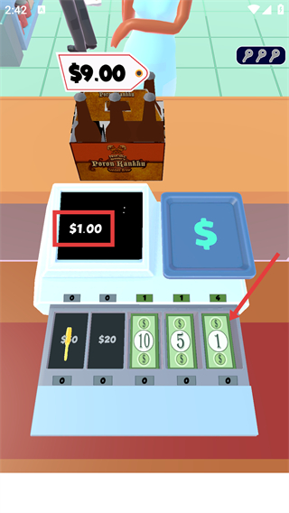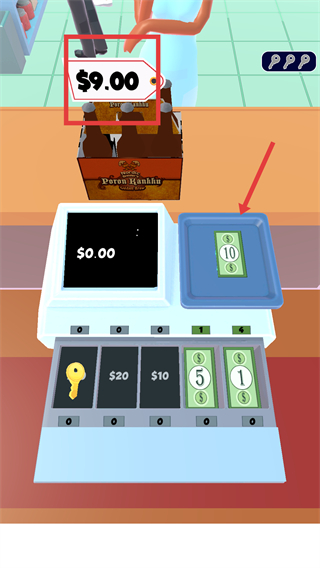 2、根据红色框内的商品价格“$9.00”,收取红色箭头指向的钞票,放入收银机对应区域。