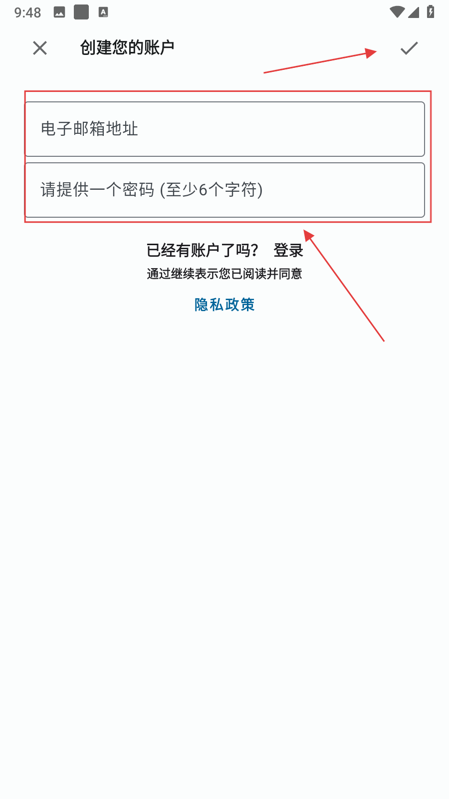 4、输入【电子邮箱地址和密码】,点击【确认】按钮,即可完成账户创建。