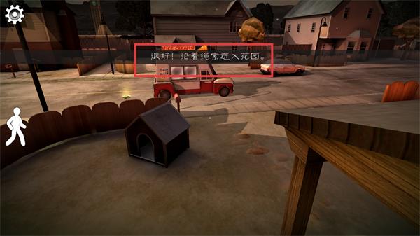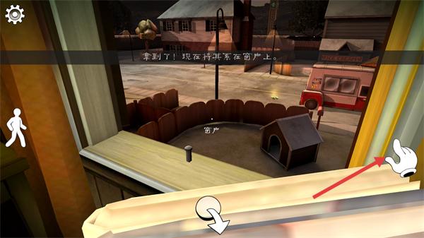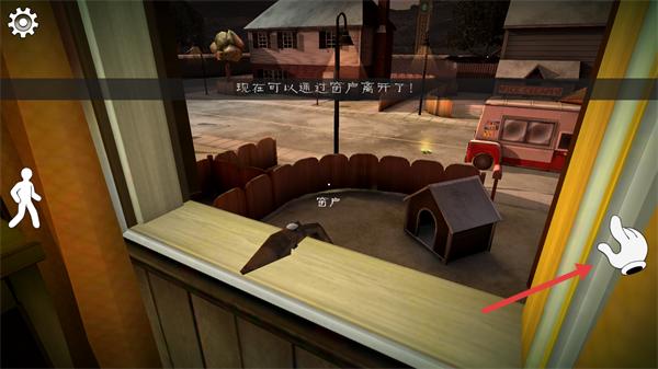 3、道具放置后,按提示通过窗户离开当前房间,进入室外场景推进剧情。