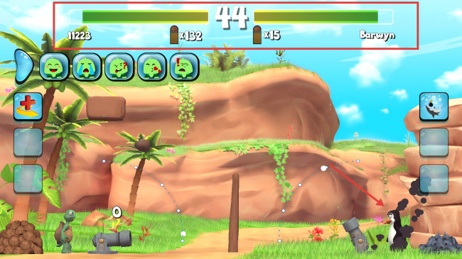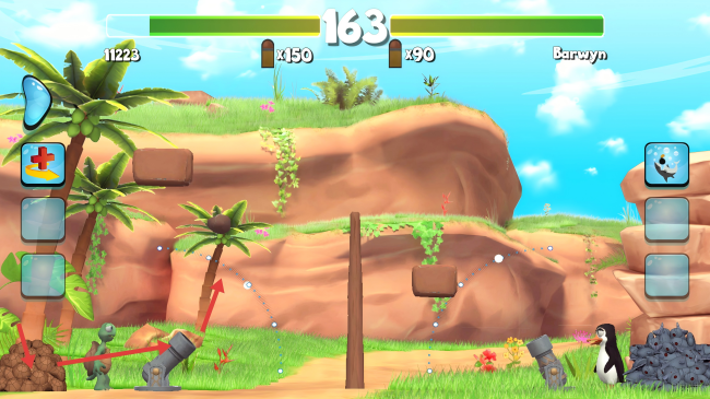 2、将土堆放入左侧大炮,调整角度发射,攻击目标。