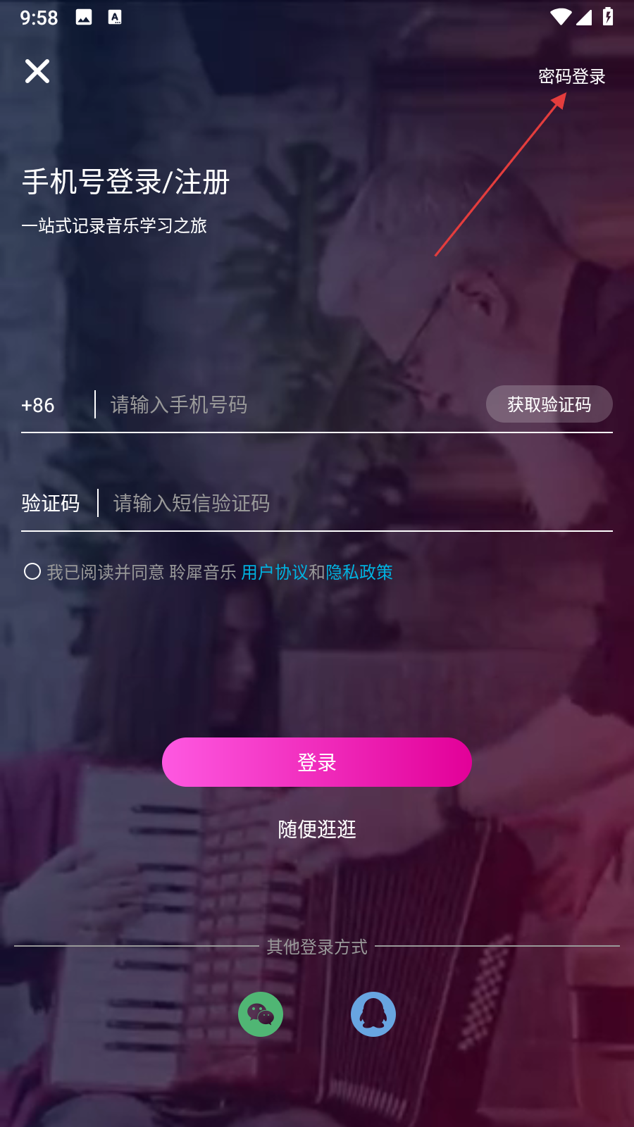 3、在手机号登录页面,点击右上角【密码登录】,切换到密码登录页面。