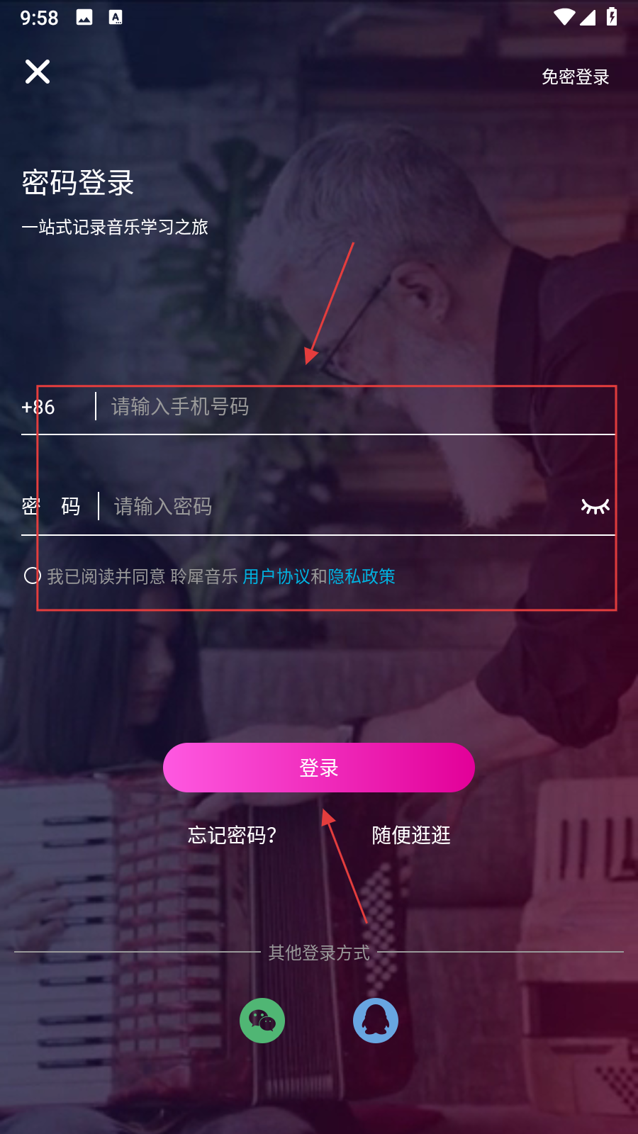 4、输入【手机号码和密码】,勾选协议后点击【登录】,即可完成登录操作。