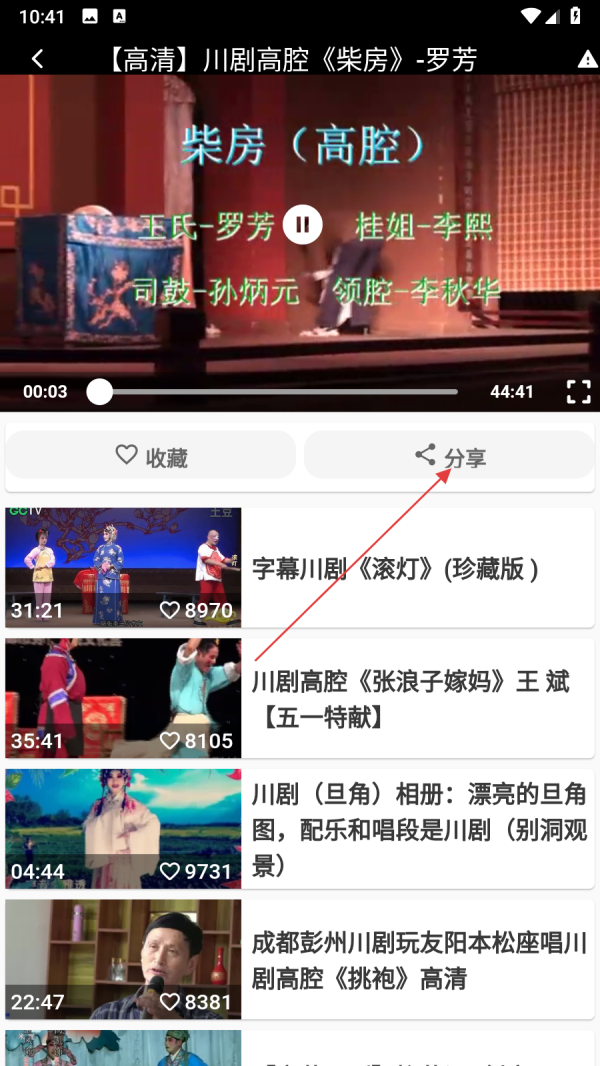 4、在视频播放页面,点击【分享】,即可将川剧视频分享给他人。