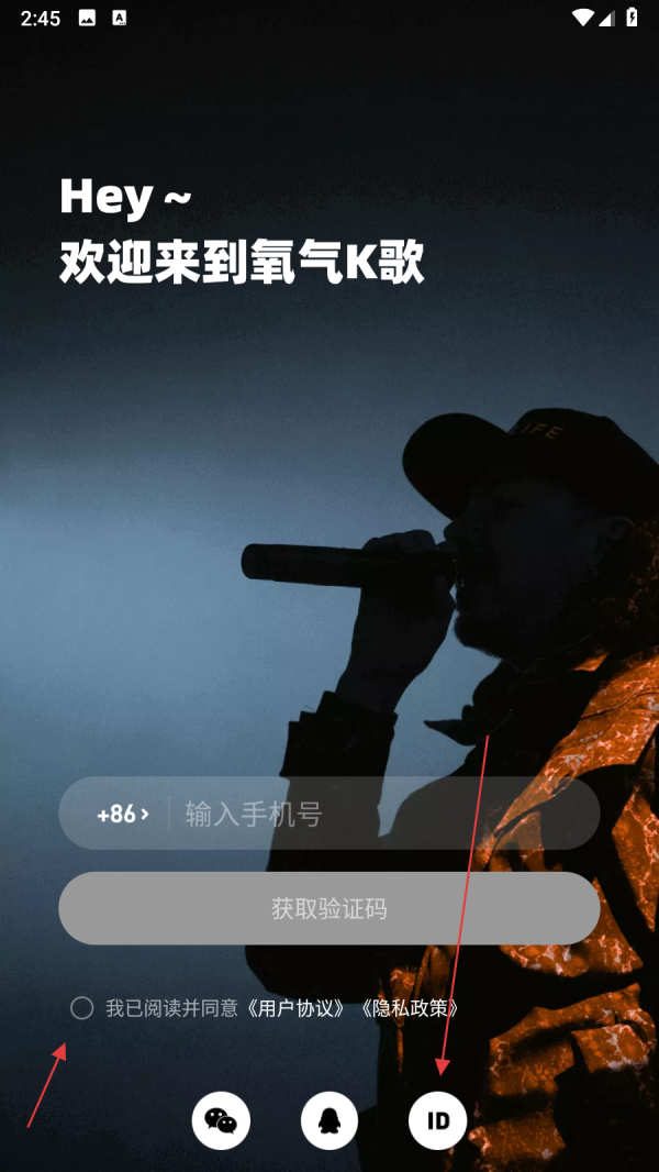 1、在氧气K歌欢迎页面,点击【同意协议】然后右下角【ID】,进入ID登录页面。