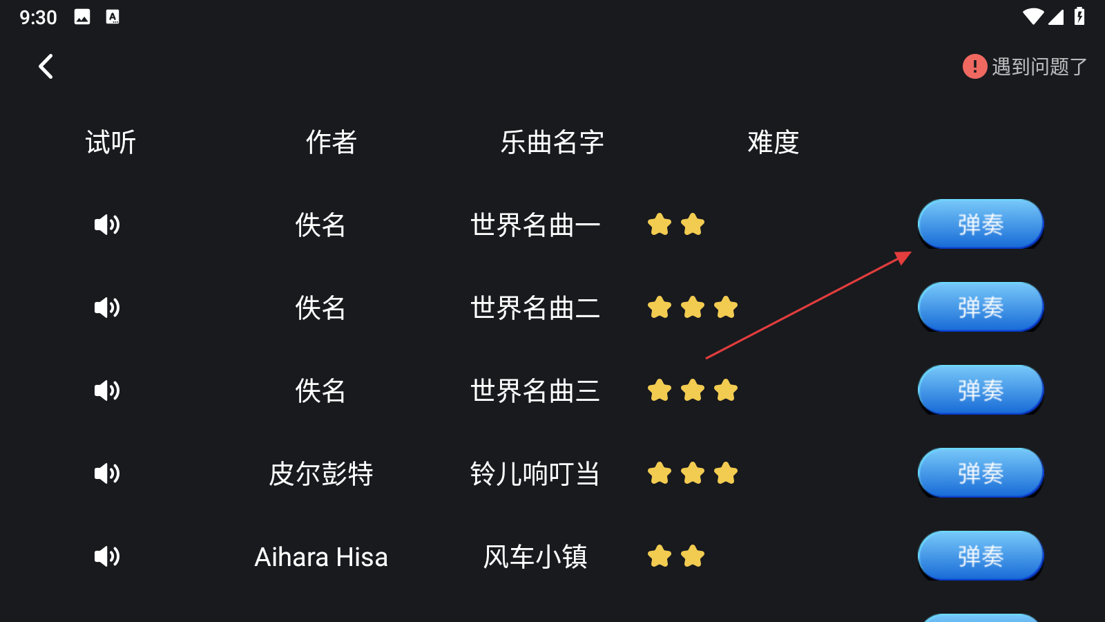 2、在乐曲选择页面,找到喜欢的琴谱,点击其右侧的【弹奏】,进入魔法钢琴弹奏界面。