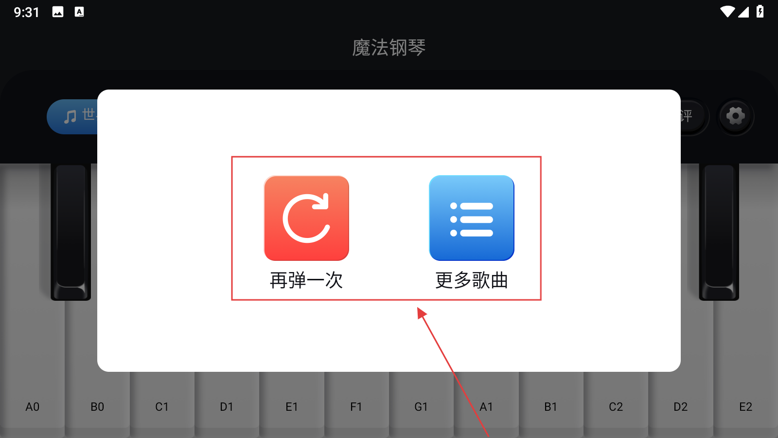 4、弹奏结束后,可选择【再弹一次】重新弹奏,也能点击【更多歌曲】挑选其他乐曲继续弹奏。