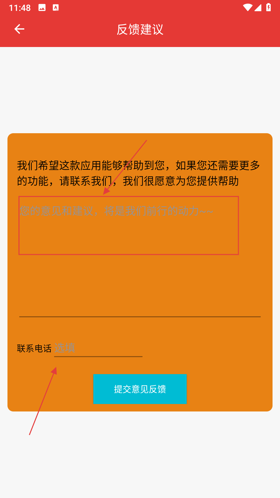 3、在反馈建议页面,输入【意见和建议】,并选填【联系电话】。