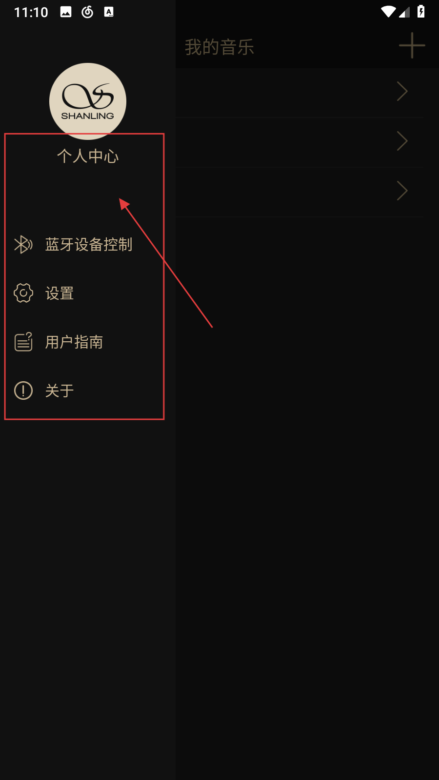 3、打开侧边栏,可进行【蓝牙设备控制】,也能查看【设置、用户指南】,了解应用相关信息。