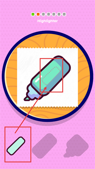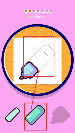 1、在【Highlighter】关卡界面,选择底部的小组件,将其拖动到纸张的虚线轮廓处,开启组装流程啦。