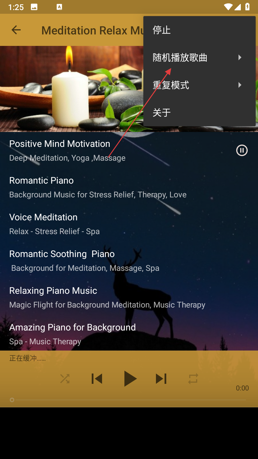 3、在弹出的操作菜单中,点击【随机播放歌曲】,展开随机播放选项。