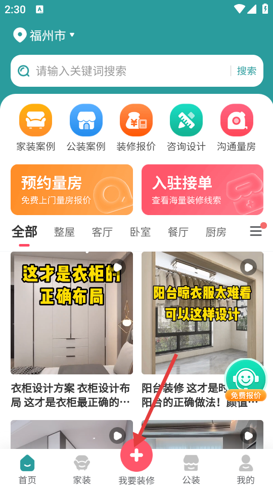 3、点击【我要装修】后,会出现预约上门量房和咨询装修设计选项,点击【预约上门量房】下的【立即预约】。