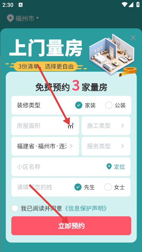 4、进入上门量房预约页面,填写房屋面积、小区名称等信息后,点击【立即预约】完成操作。
